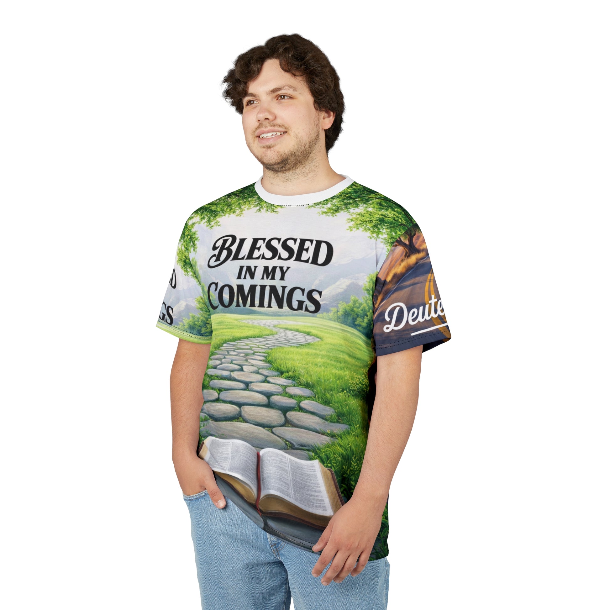 This faith inspired Blessed in my comings and goings T-Shirt exudes bold confidence and positivity and is perfect for anyone looking to spread a message of blessings and gratitude wherever they enter and leave. It serves as a reminder of God's favor and faithfulness over His followers. Ideal for Christians, spiritual individuals, and those celebrating religious holidays and occasions. Great for casual wear or as a thoughtful gift for friends and family.